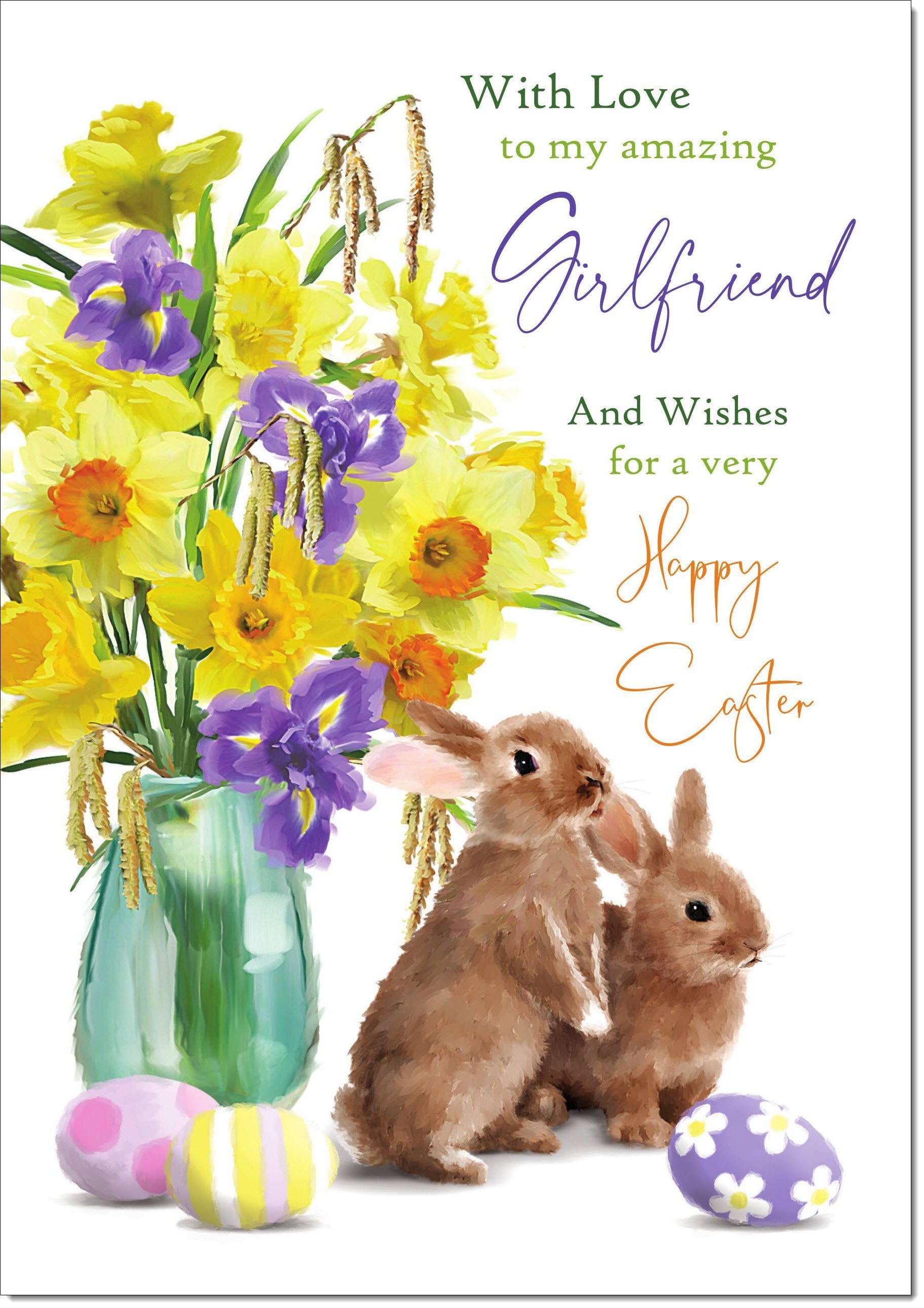Girlfriend Easter Card Vase of Daffodils with Bunnies and Eggs