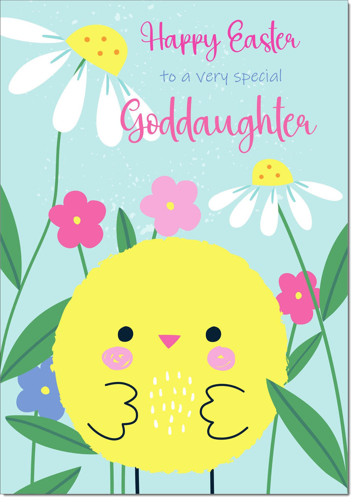 Goddaughter Easter Card Yellow Chick and Spring Flowers