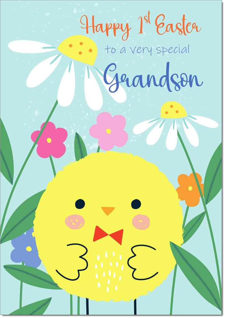 Grandson Easter Card Yellow Chick and Spring Flowers