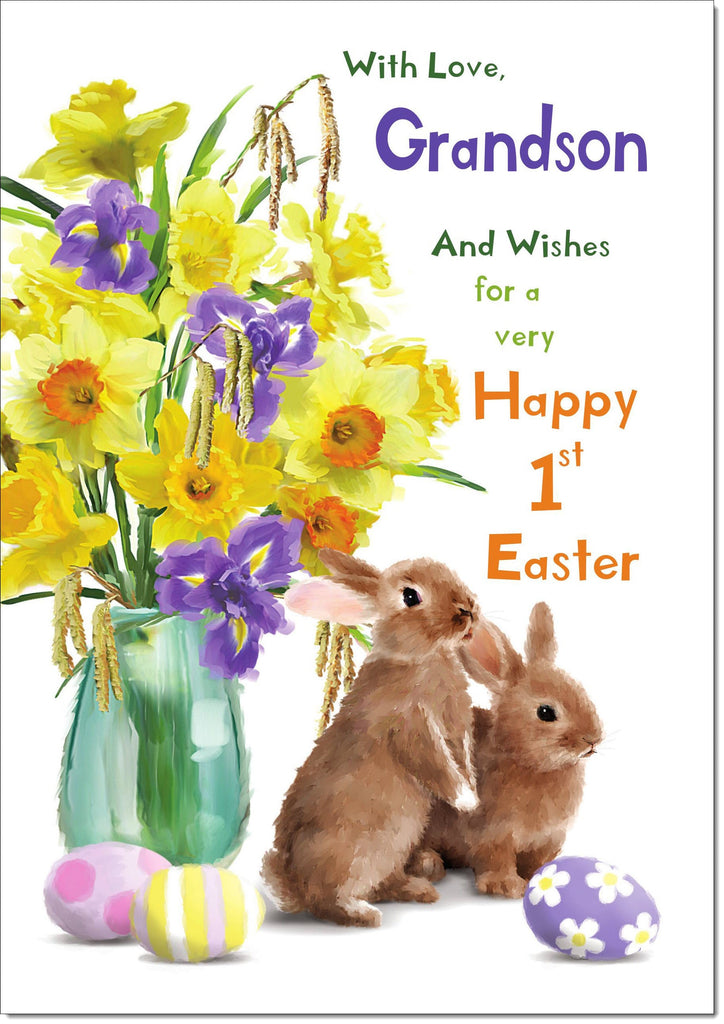 Grandsons 1st First Easter Card Vase of Daffodils with Bunnies and Eggs
