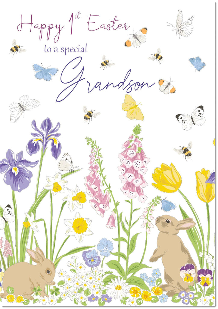 Grandsons 1st First Easter Card Spring Flowers with Bunnies