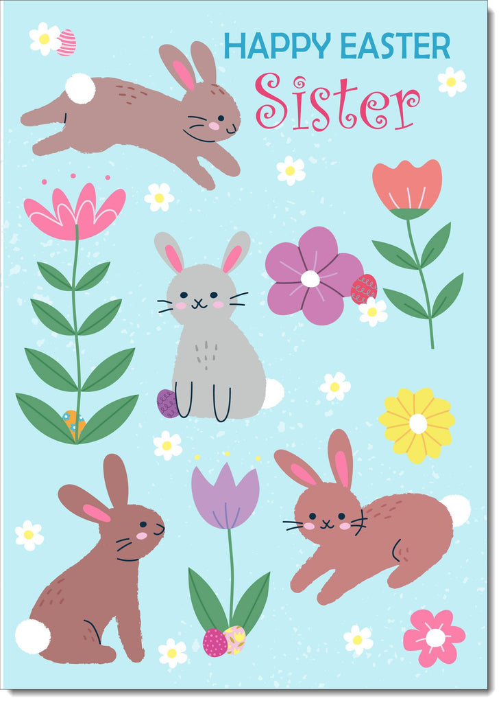 Sister Easter Card Vase of Daffodils with Bunnies and Eggs
