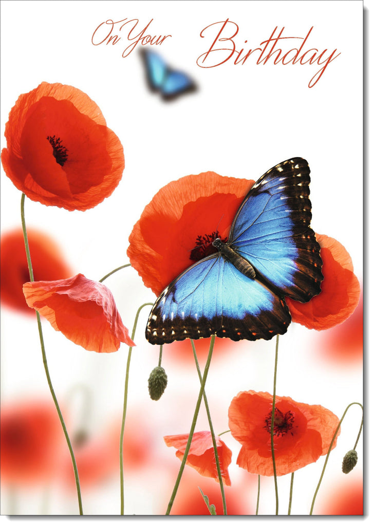 Happy Birthday Card Poppies and Blue Butterflies