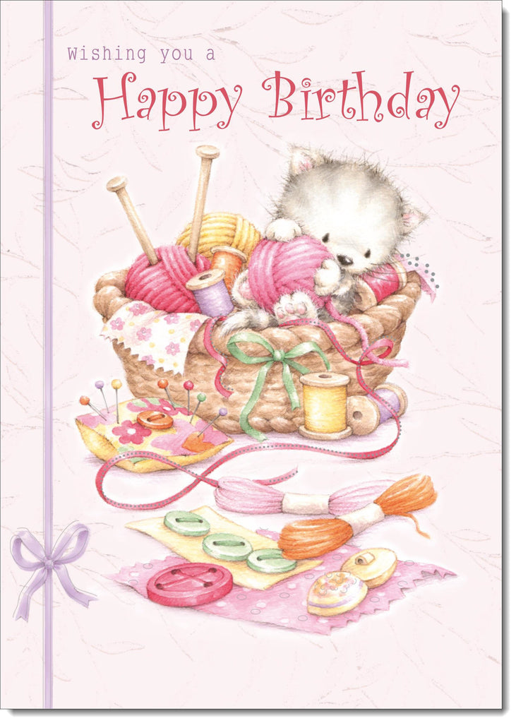 Happy Birthday Card Kitten in Sewing Basket