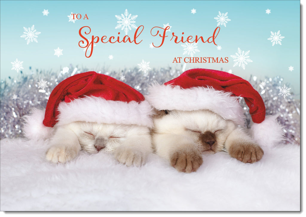 Special Friend Christmas Card Puppy and Kitten with Santa Hats