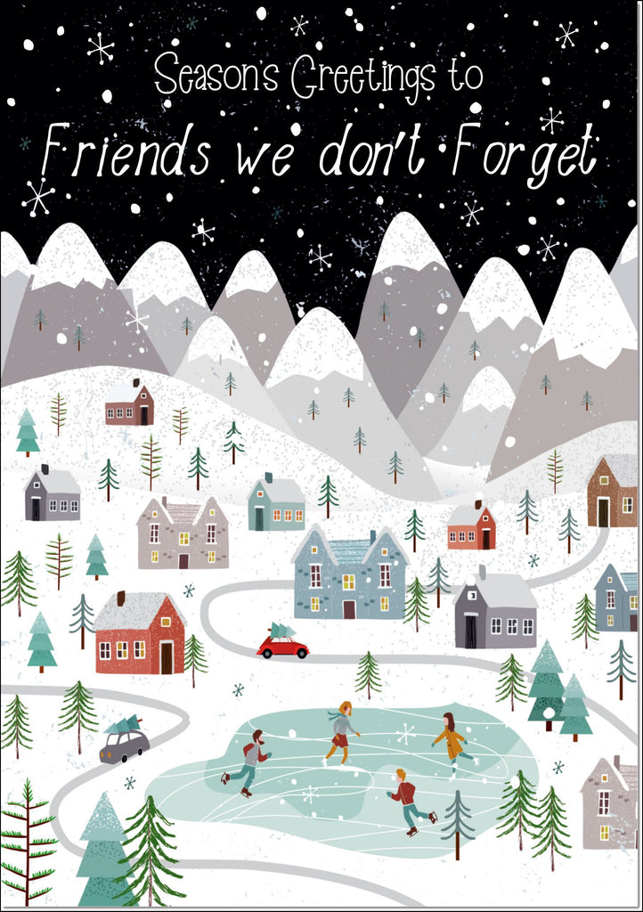 Friends We Don't Forget Christmas Card Mountain Scene In Snowy Village