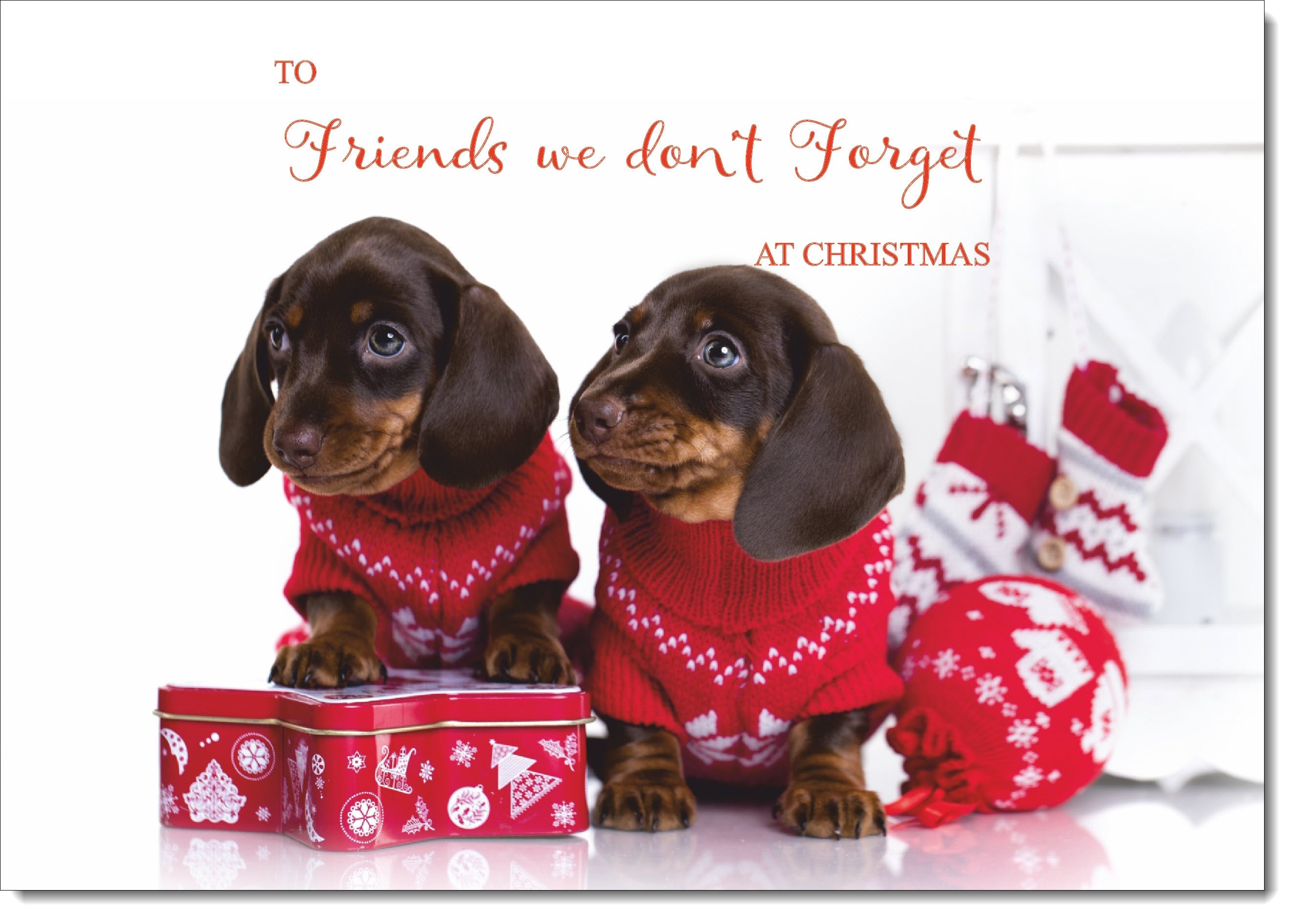 Friends We Don't Forget Christmas Card Dachshund Puppies in Christmas Jumpers