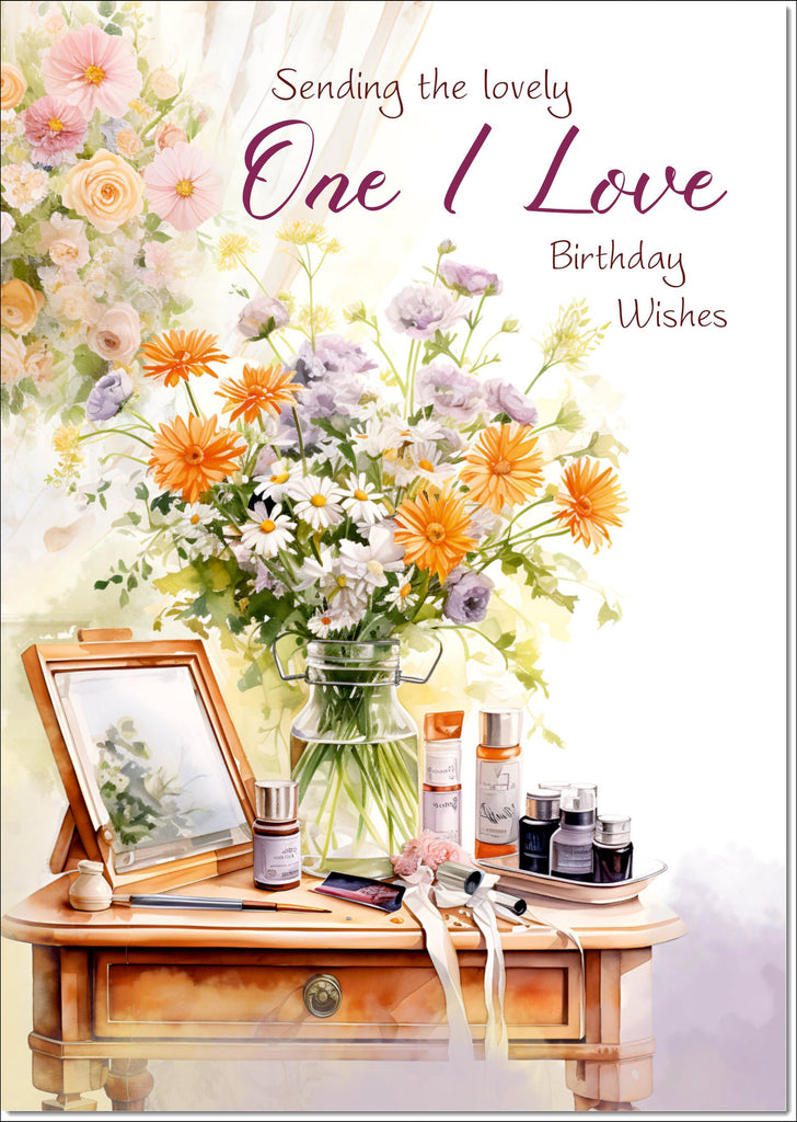 One I Love Birthday Card for Her Dressing Table Bouquet