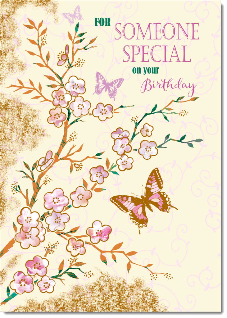 Fiancee Birthday Card Pink Blossom and Butterflies
