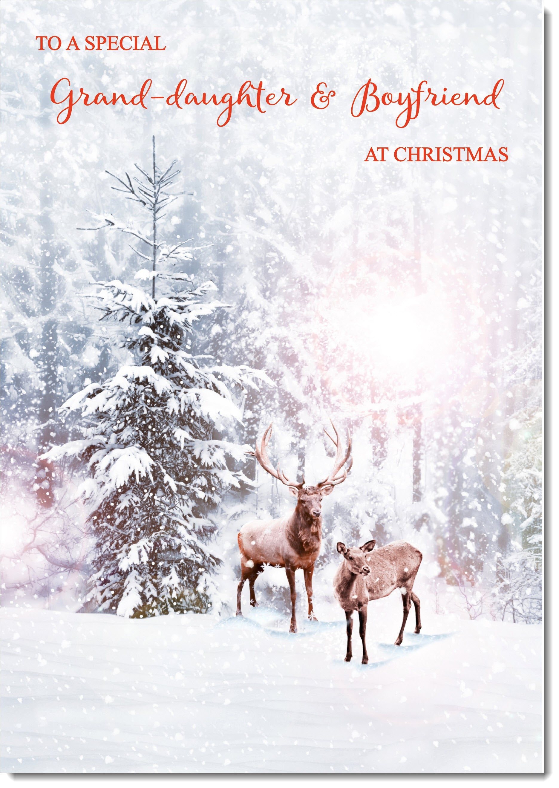 Granddaughter & Boyfriend Christmas Card Stag and Doe in Snowy Forest