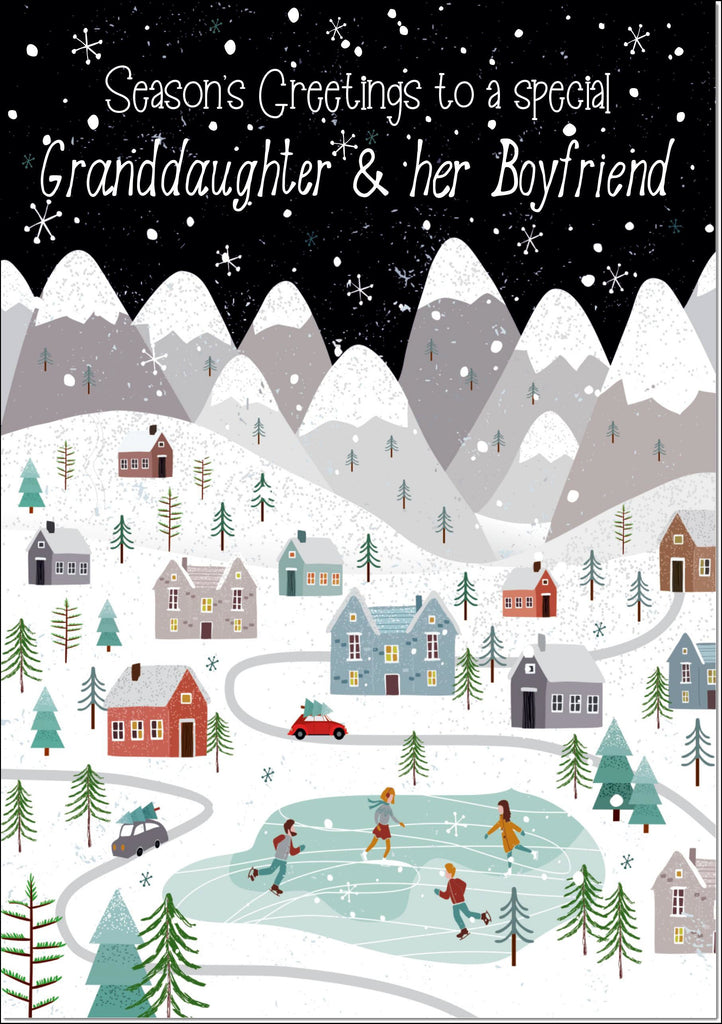 Granddaughter & Boyfriend Christmas Card Mountain Scene In Snowy Village