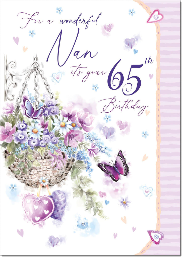Nan 65th Birthday Card Age 65 Purple Hanging Basket