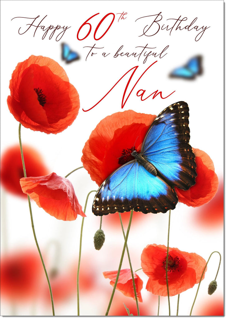 Nan 60th Birthday Card Age 60 Poppies and Blue Butterflies
