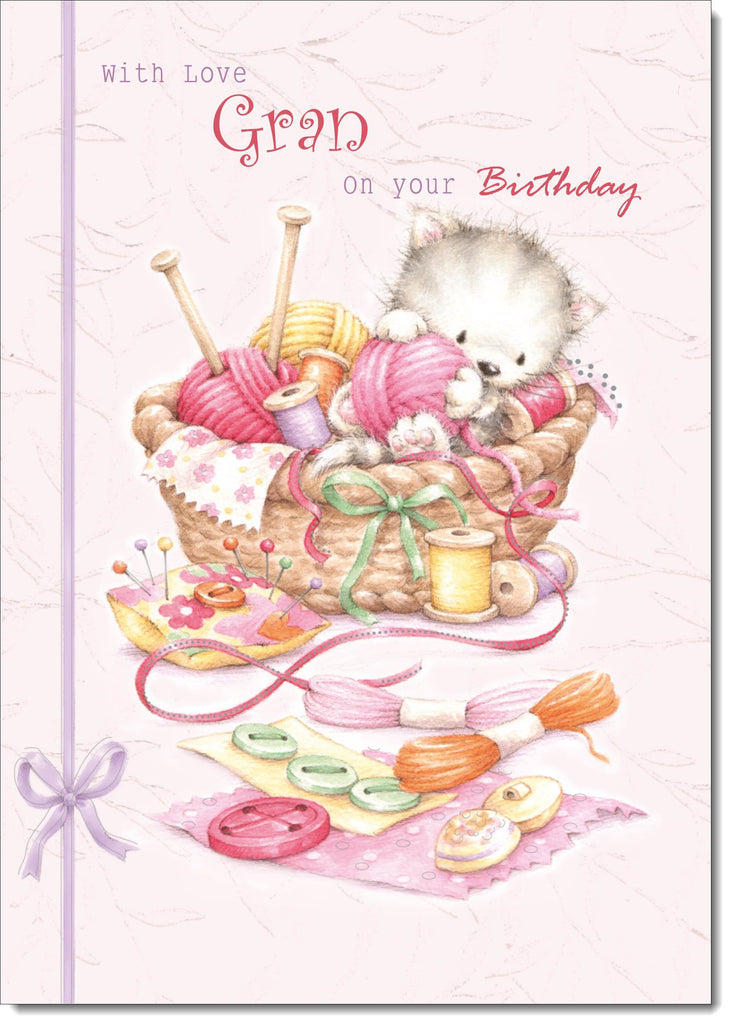 Gran Birthday Card Kitten in Sewing Basket