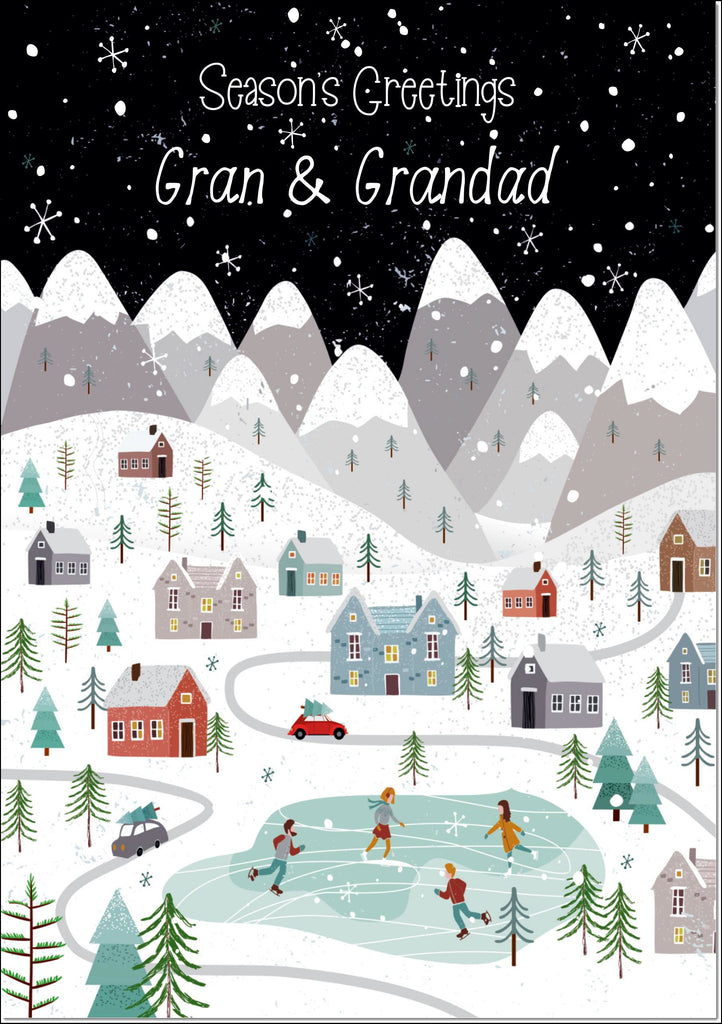 Gran & Grandad Christmas Card Mountain Scene In Snowy Village
