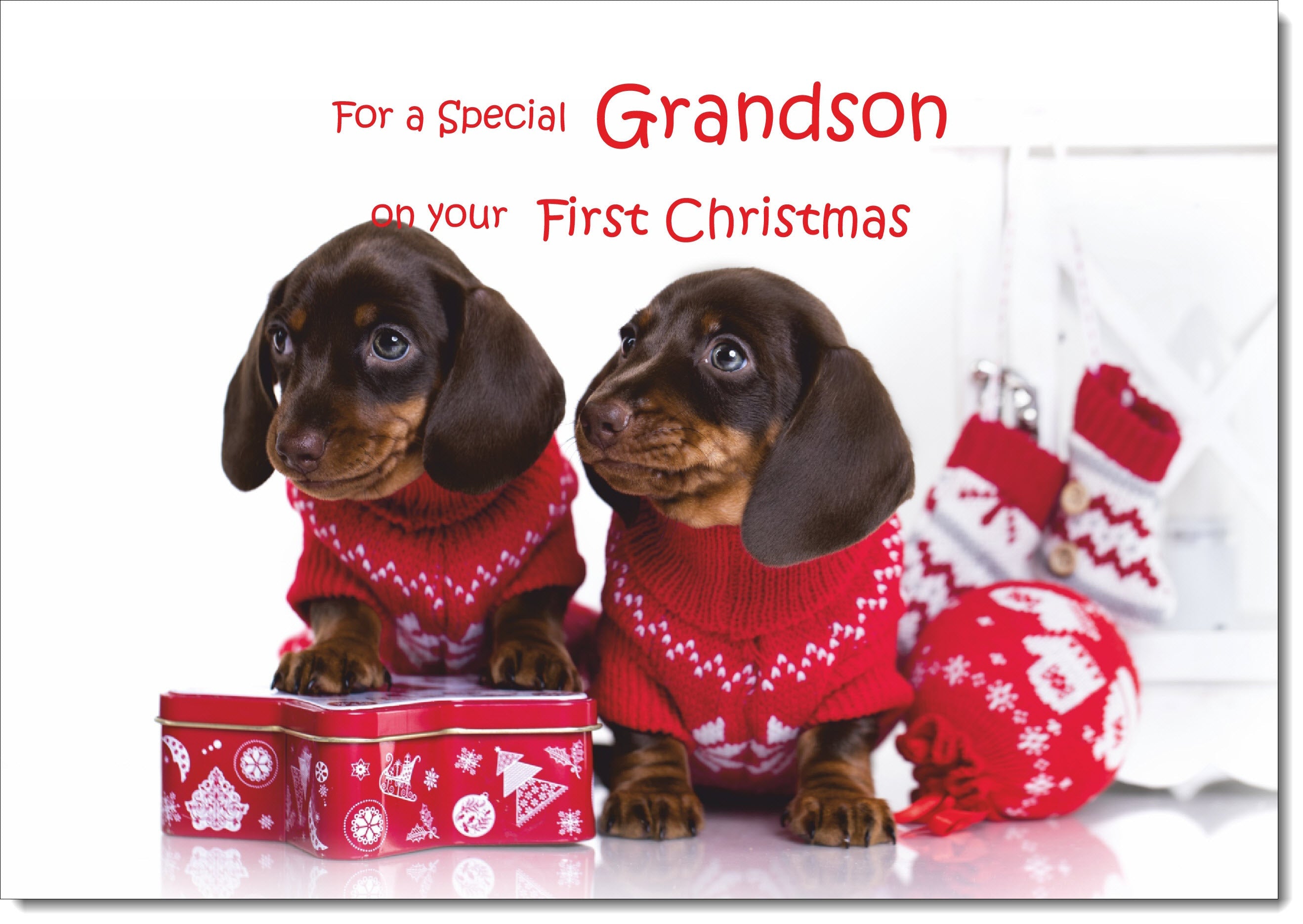 Grandsons 1st Christmas Card Dachshund Puppies in Christmas Jumpers