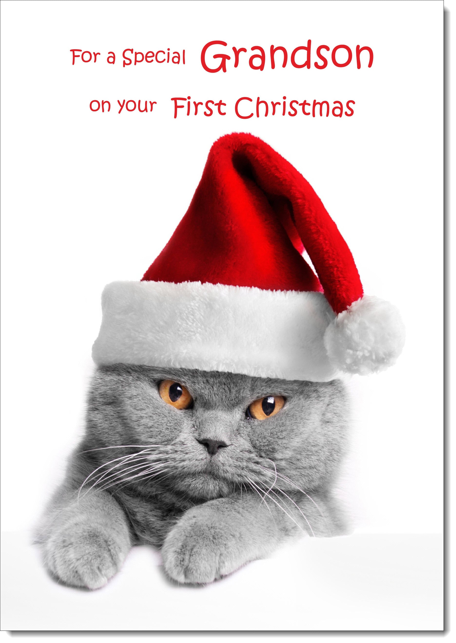 Grandsons 1st Christmas Card Grey Cat with Santa Hat