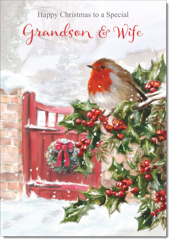 Grandson & Wife Christmas Card Robin on Holly Tree