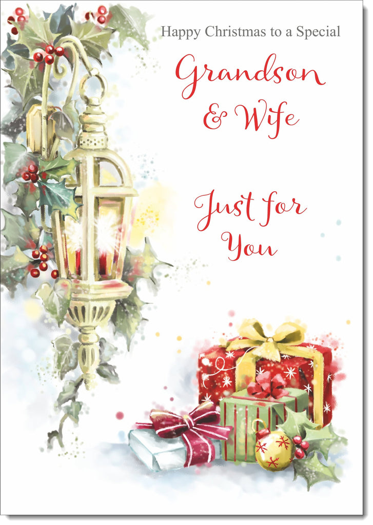 Grandson & Wife Christmas Card Red Lantern & Christmas Presents