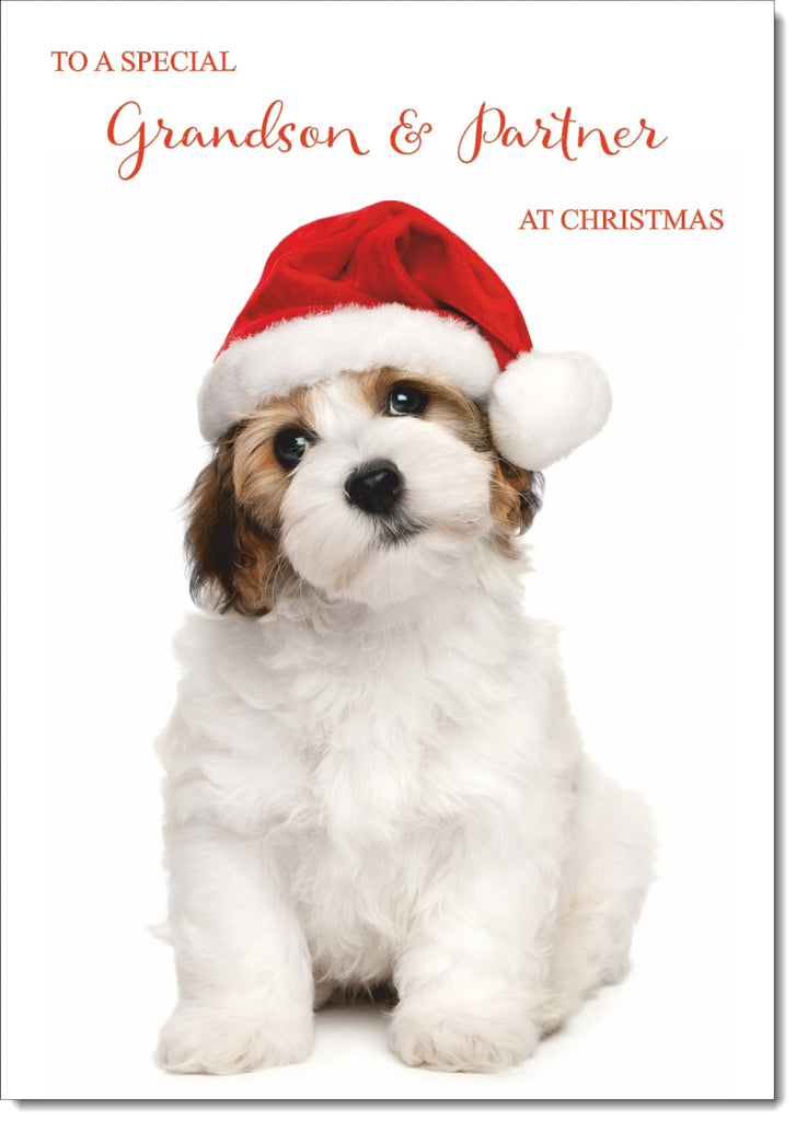 Grandson & Partner Christmas Card Dog and Santa Hat