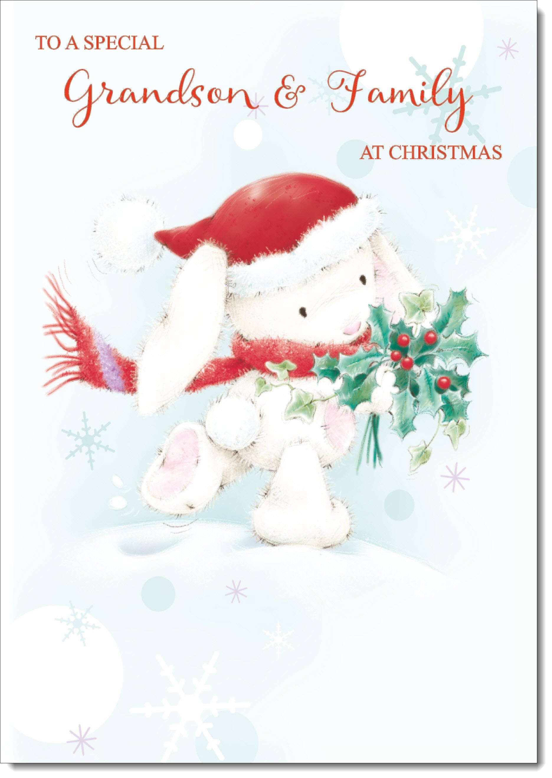 Grandson & Family Christmas Card Cute Rabbit with Holly