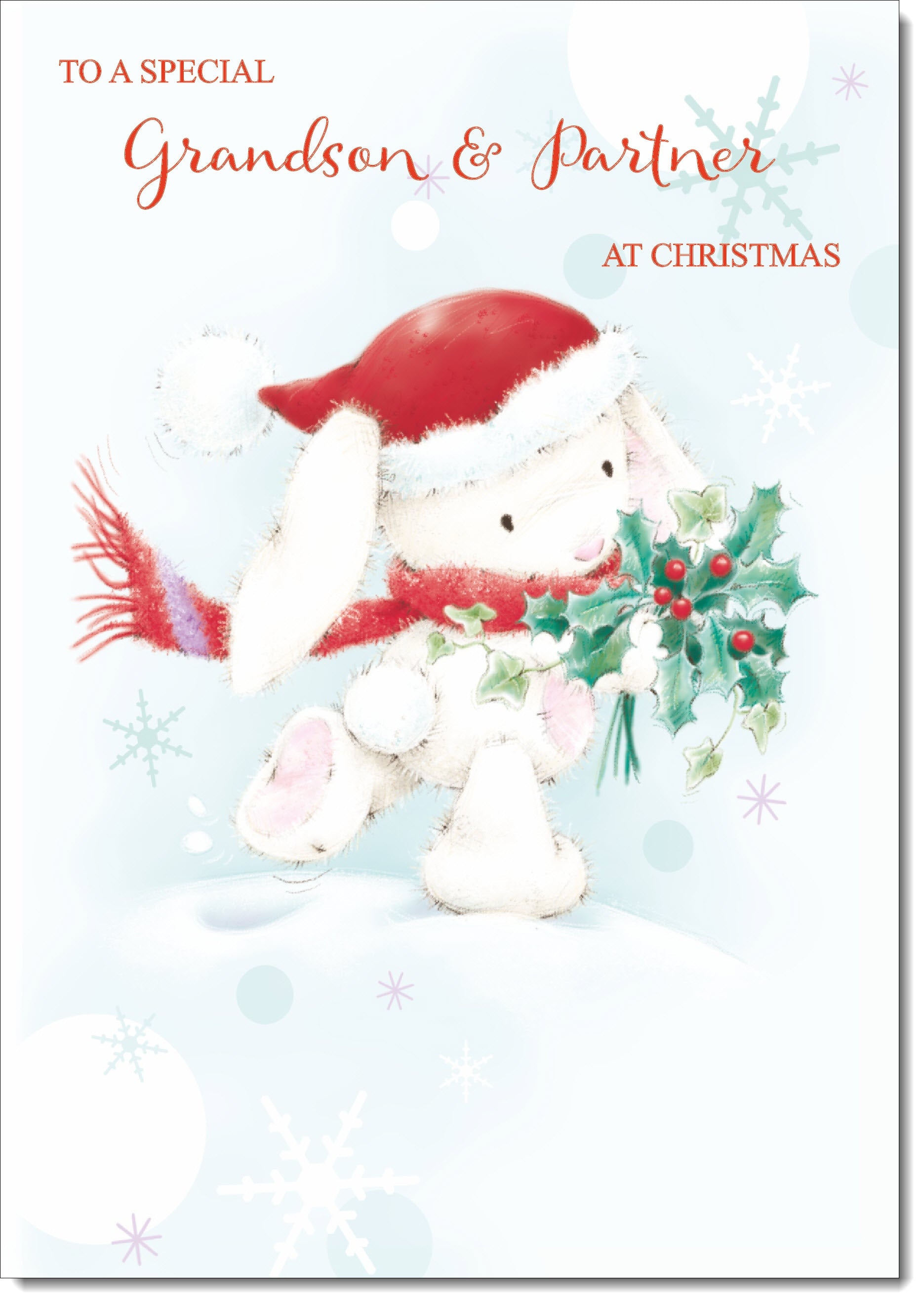 Grandson & Partner Christmas Card Cute Rabbit with Holly