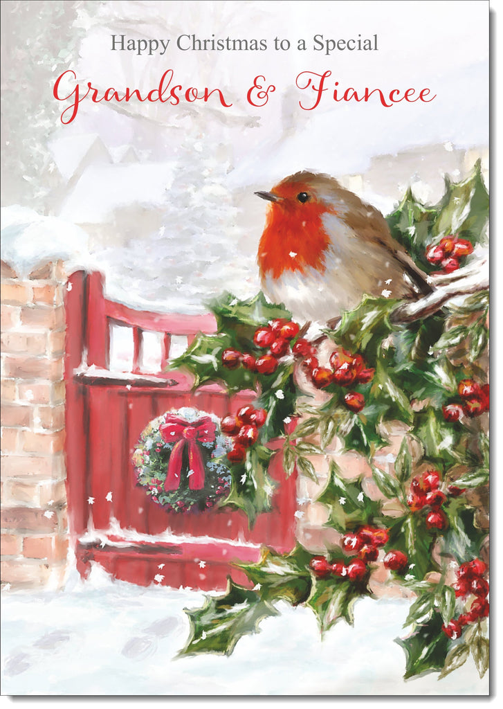 Grandson & Fiancee Christmas Card Robin on Holly Tree