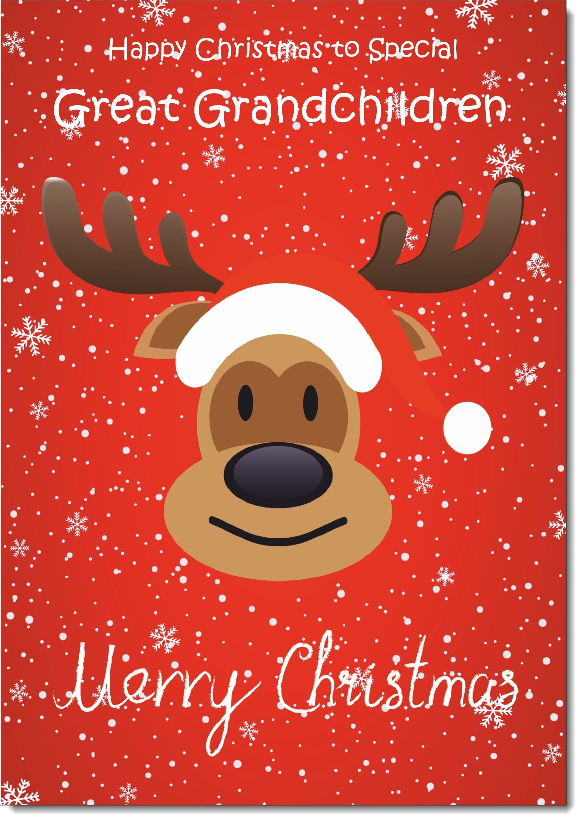 Great Grandchildren Christmas Card Rudolph on Red Background