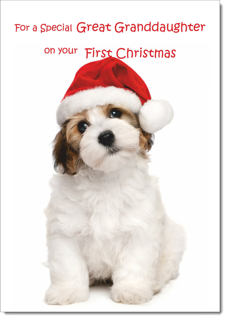 Great Granddaughters 1st Christmas Card Fluffy Dog in Santa Hat