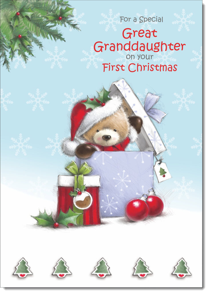 Great Granddaughters 1st Christmas Card Cute Bear in Christmas Parcel