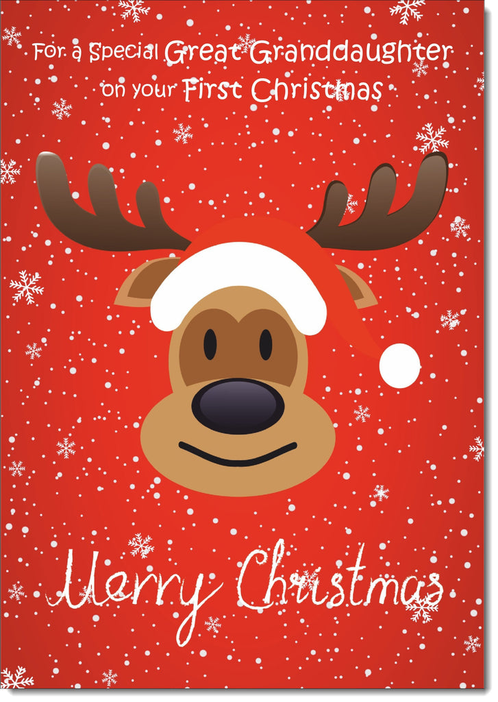 Great Granddaughters 1st Christmas Card Rudolph on Red Background