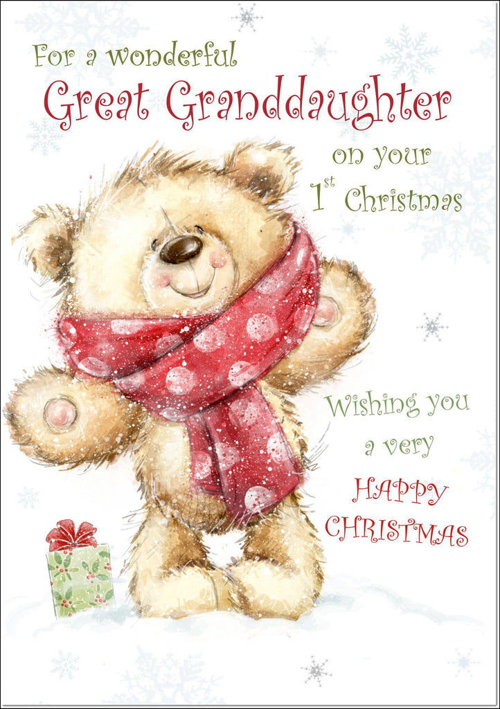 Great Granddaughters 1st Christmas Card Teddy Bear With Red Scarf