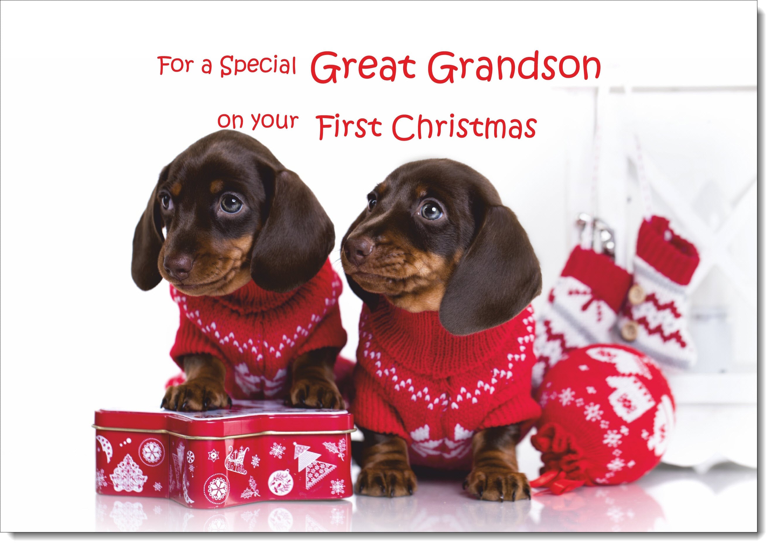 Great Grandsons 1st Christmas Card Dachshund Puppies in Christmas Jumpers