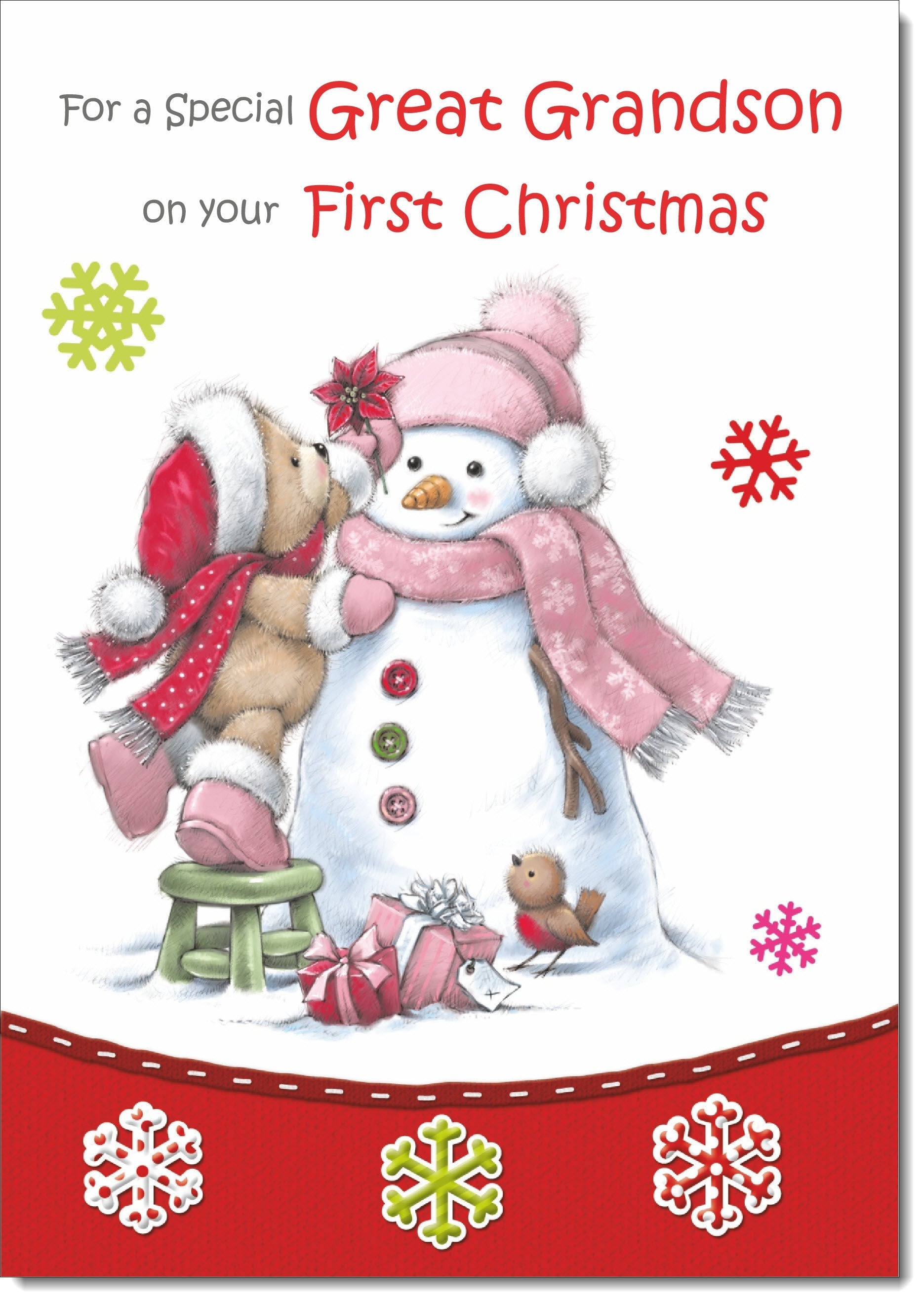 Great Grandsons 1st Christmas Card Cute Bear with Snowman