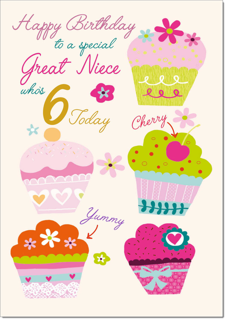 Great Niece 6th Birthday Card Age 6 Bright Cupcakes