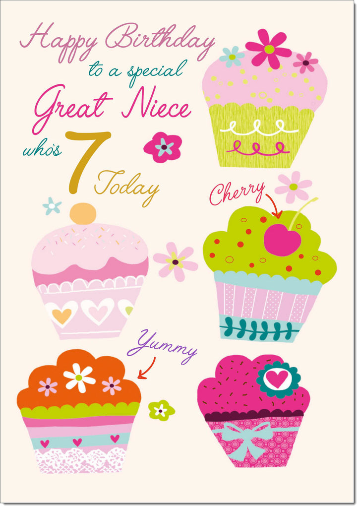 Great Niece 7th Birthday Card Age 7 Bright Cupcakes
