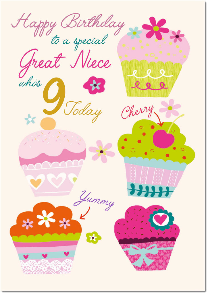 Great Niece 9th Birthday Card Age 9 Bright Cupcakes