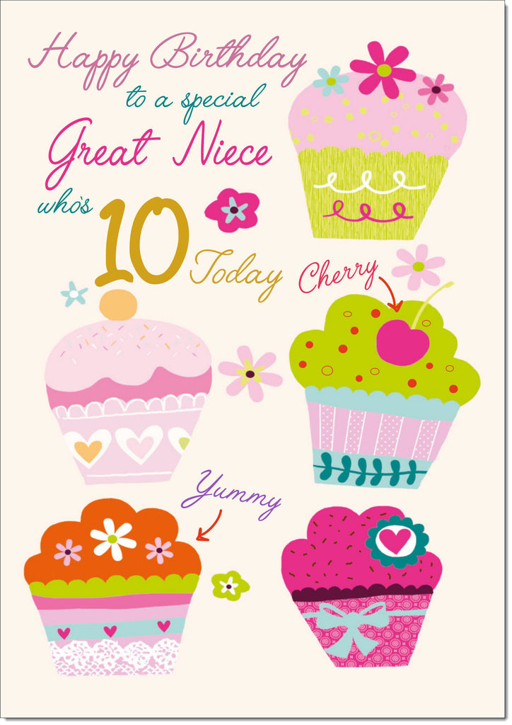 Great Niece 10th Birthday Card Age 10 Bright Cupcakes