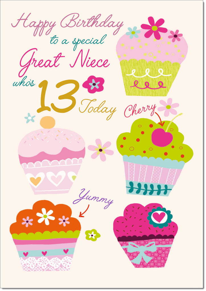 Great Niece 13th Birthday Card Age 13 Bright Cupcakes