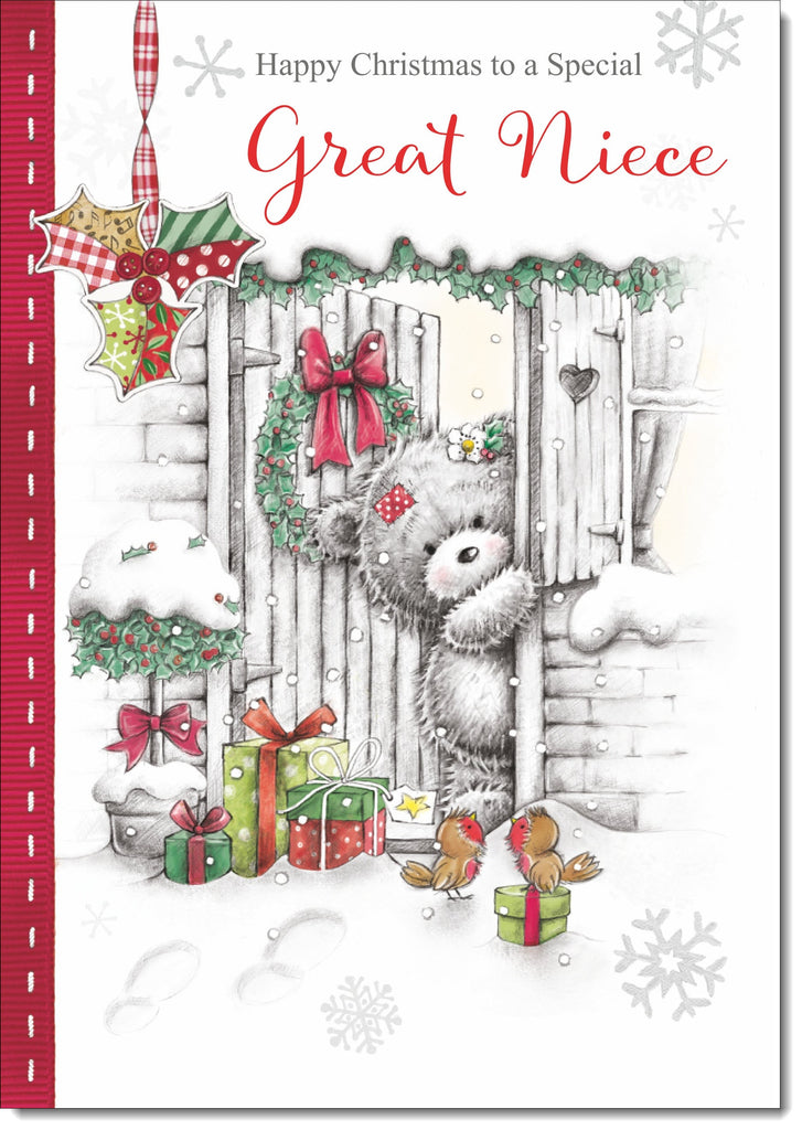 Great Niece Christmas Card Cute Bear in Christmas Parcel
