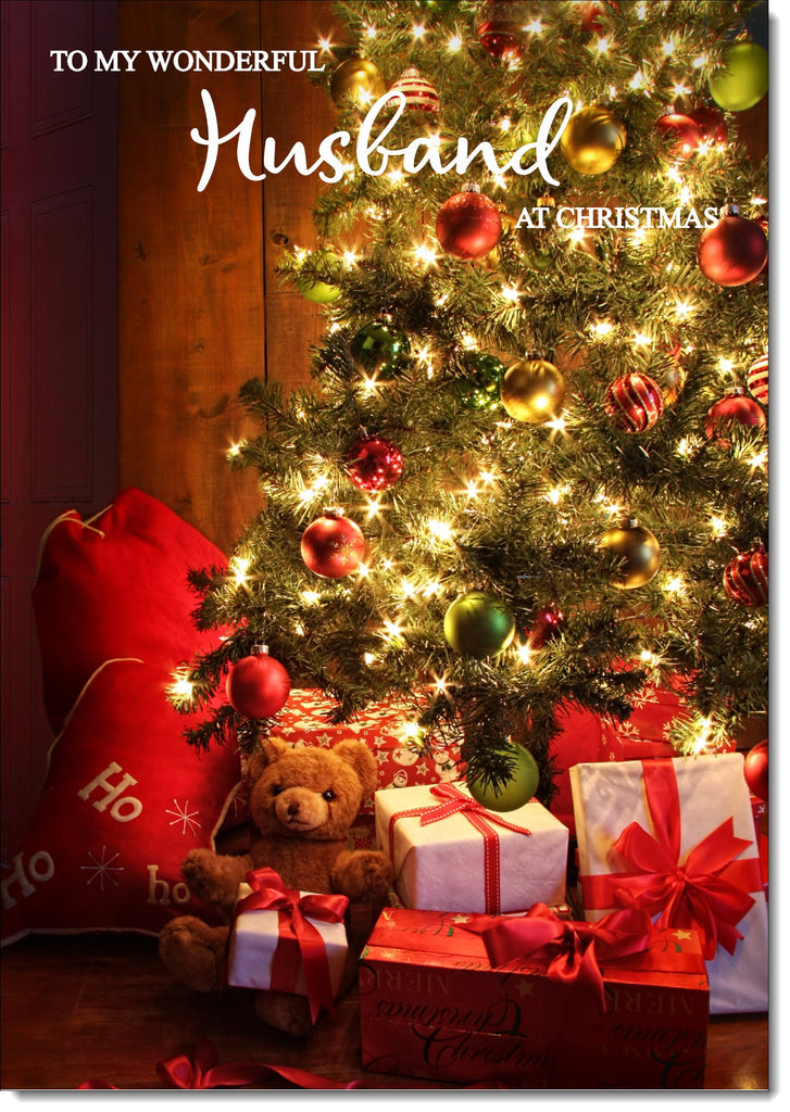 Husband Christmas Card Teddy by Christmas Tree
