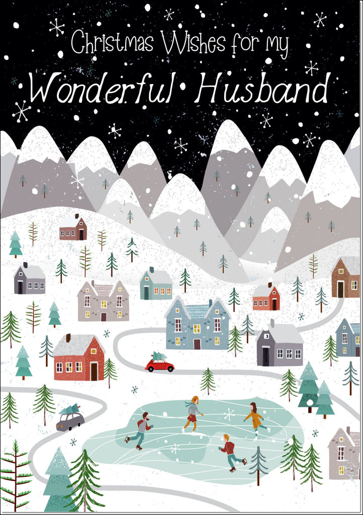 Husband Christmas Card Mountain Scene In Snowy Village