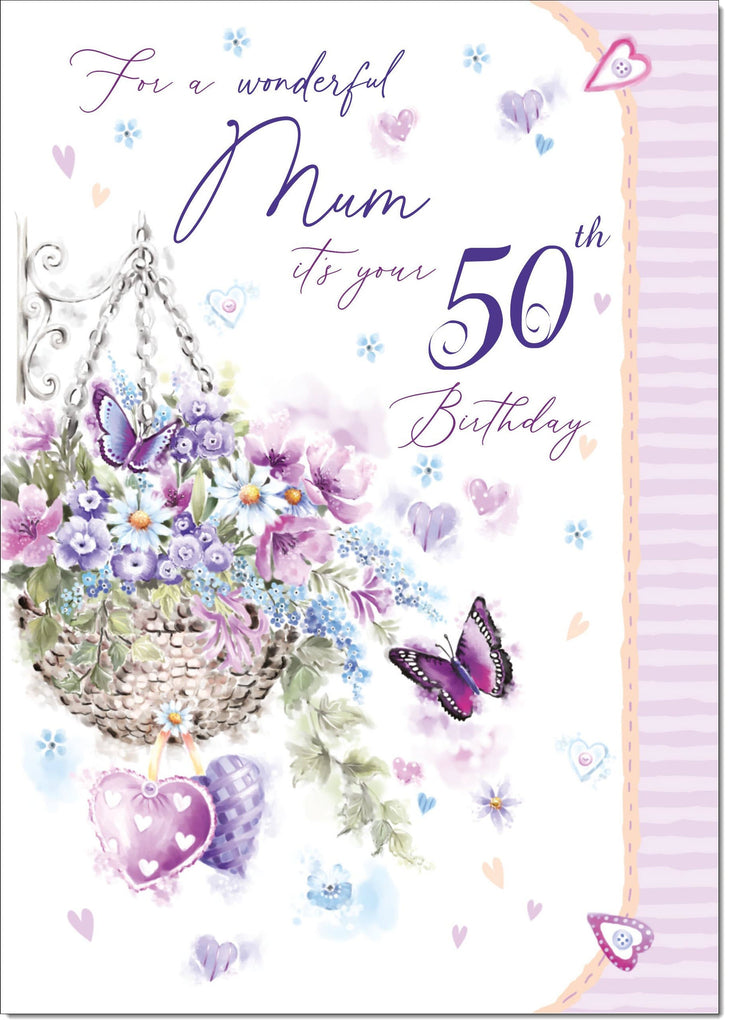 Mum 50th Birthday Card Age 50 Purple Hanging Basket