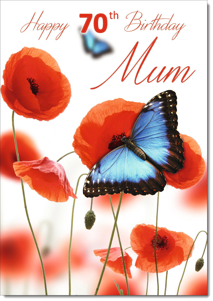 Mum 70th Birthday Card Age 70 Poppies and Blue Butterflies
