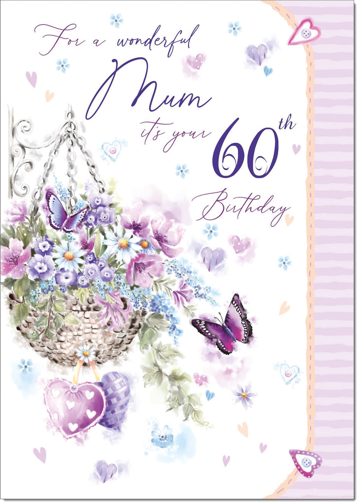 Mum 60th Birthday Card Age 60 Purple Hanging Basket
