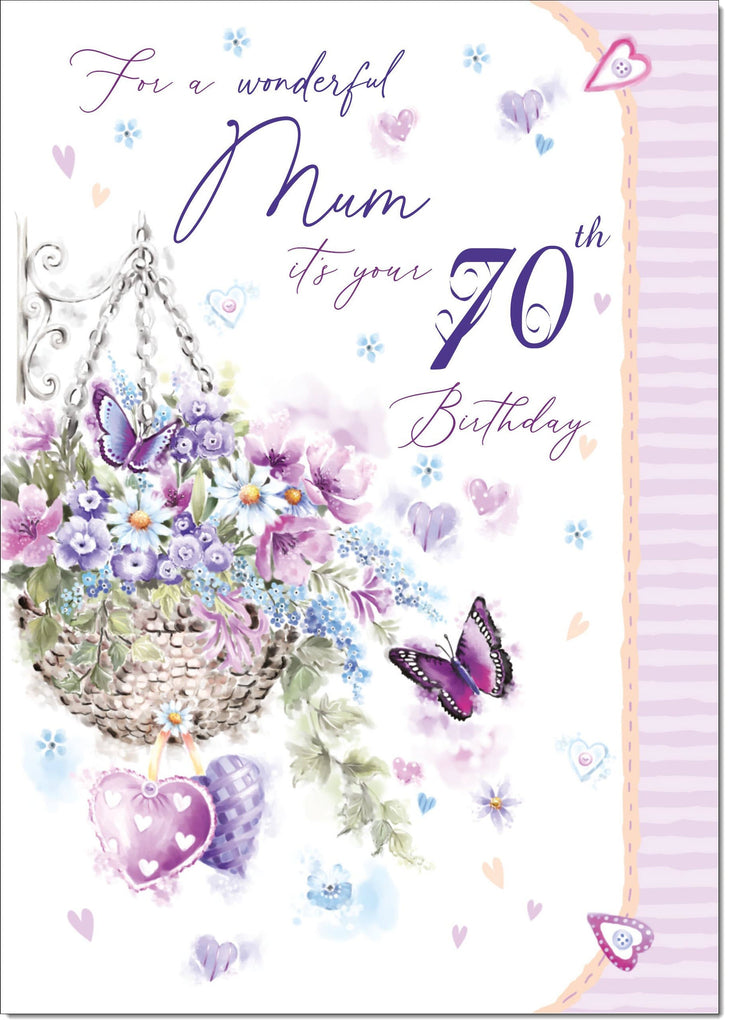 Mum 70th Birthday Card Age 70 Purple Hanging Basket