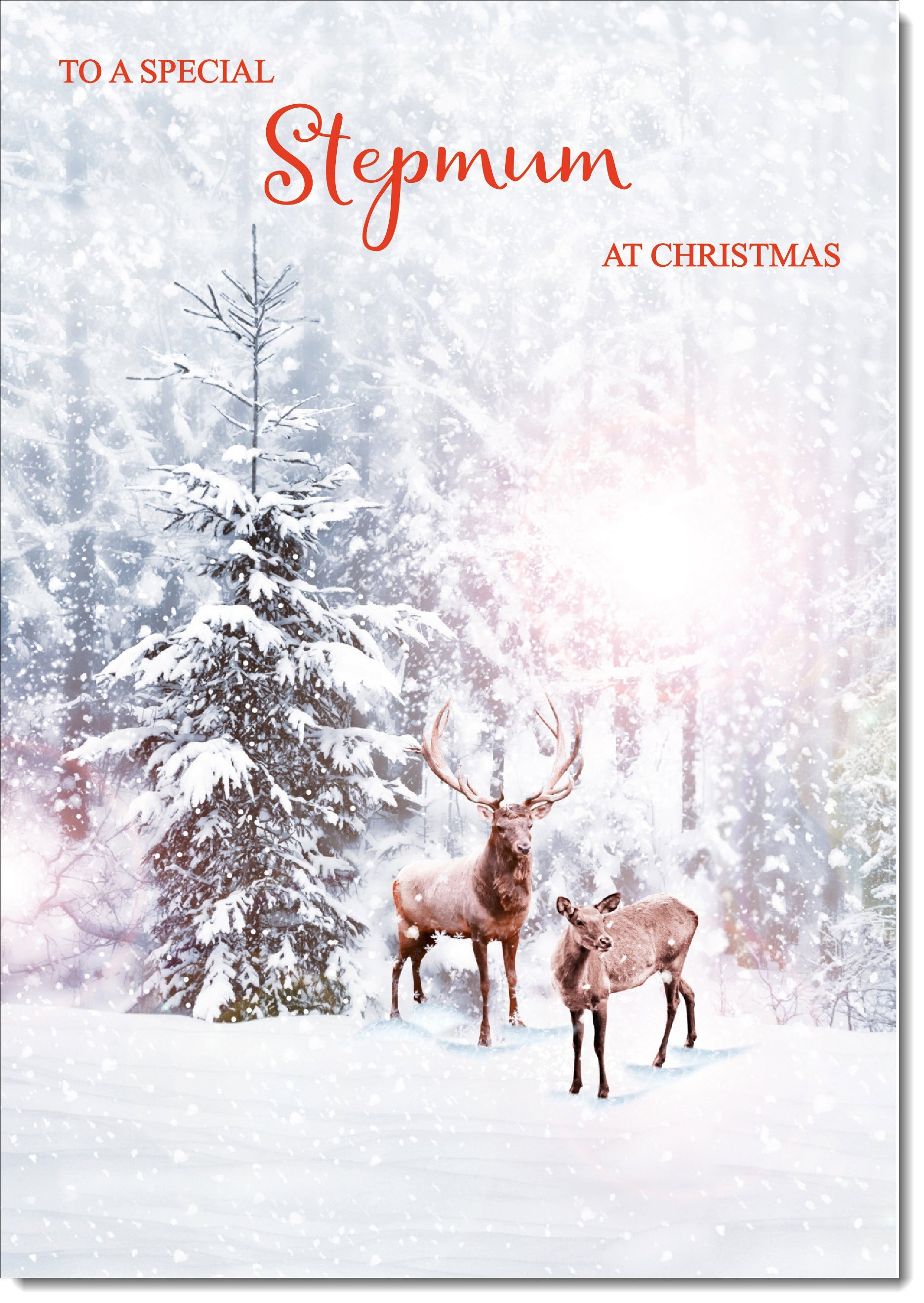 Stepmum Christmas Card Stag and Doe in Snowy Forest