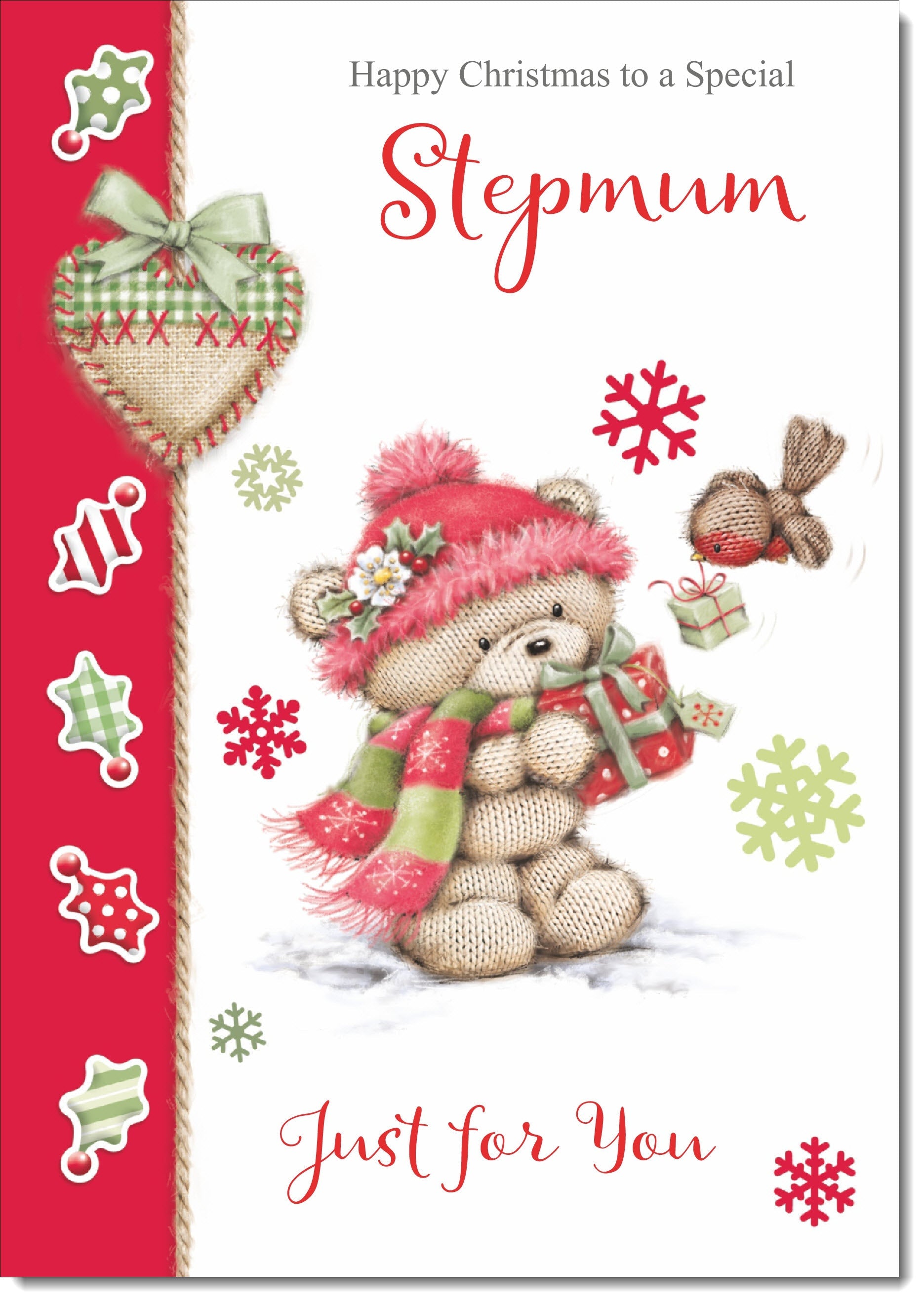 Stepmum Christmas Card Cute Bear in Pink Bobble Hat