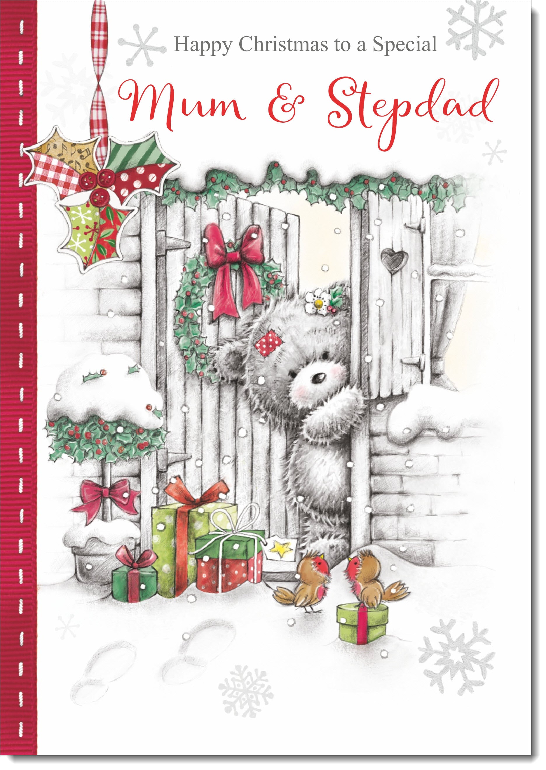 Mum & Stepdad Christmas Card Grey Bear in Snow