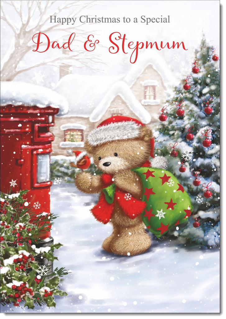 Dad & Stepmum Christmas Card Cute Bear at Post Box